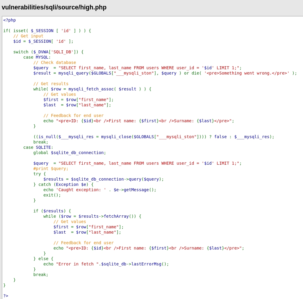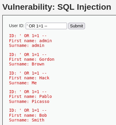 SELECT first_name, last_name FROM users WHERE user_id = '' OR 1=1 -- ';