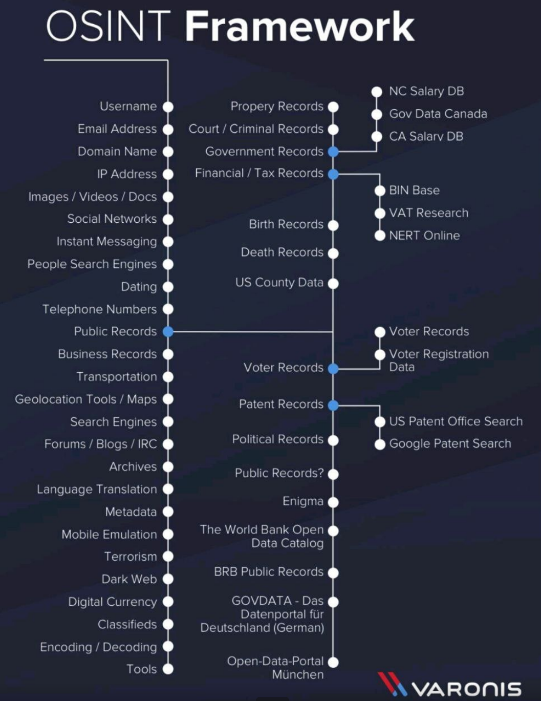 **Reconnaissance**, aka "recon", (often associated with information gathering) involves collecting information about a target system or organization using passive methods. This means gathering data without directly interacting with the target system, network, or organization.**Footprinting** is a specific phase of reconnaissance that focuses on gathering detailed information about a target system, network, or organization in order to create a "footprint" of its digital presence. This involves both passive and active methods to collect data about IP addresses, domain names, network infrastructure, organization structure, technical contacts, and more.In a website, we try to seek information about: