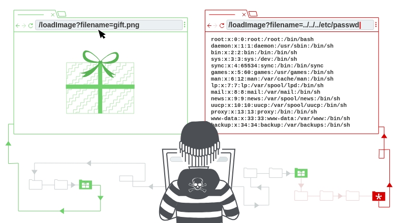 An attacker takes advantage of lax input validation or insufficient sanitazation of user input, manipulating the imput by adding special characters or sequences that trick the app into navigating to directories out of scope permission (e.g. root file permission: /etc/passwd and /etc/shadow).