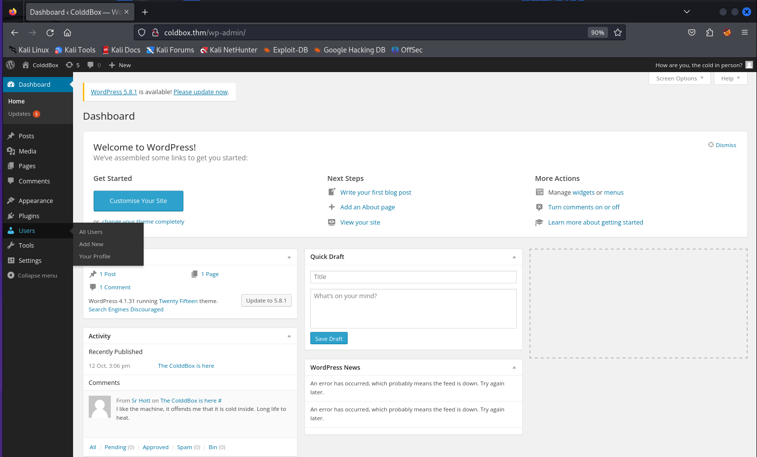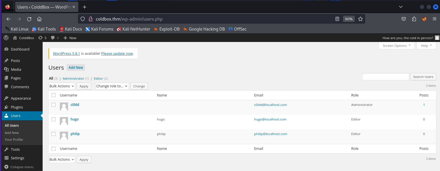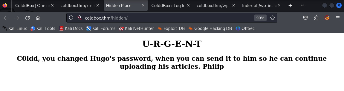 If we don't waste time, we can use wpscan to find user list, but we'll take it if we take results with our three users, then try to login with C0ldd/Hugo/Philip:password123 (what we've see in the hidden path).