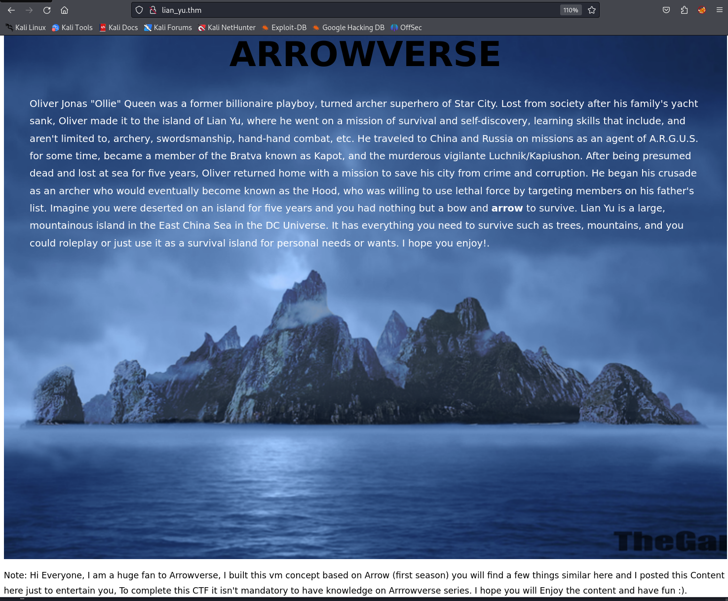 Note: Hi Everyone, I am a huge fan to Arrowverse, I built this vm concept based on Arrow (first season) you will find a few things similar here and I posted this Content here just to entertain you, To complete this CTF it isn't mandatory to have knowledge on Arrrowverse series. I hope you will Enjoy the content and have fun :).