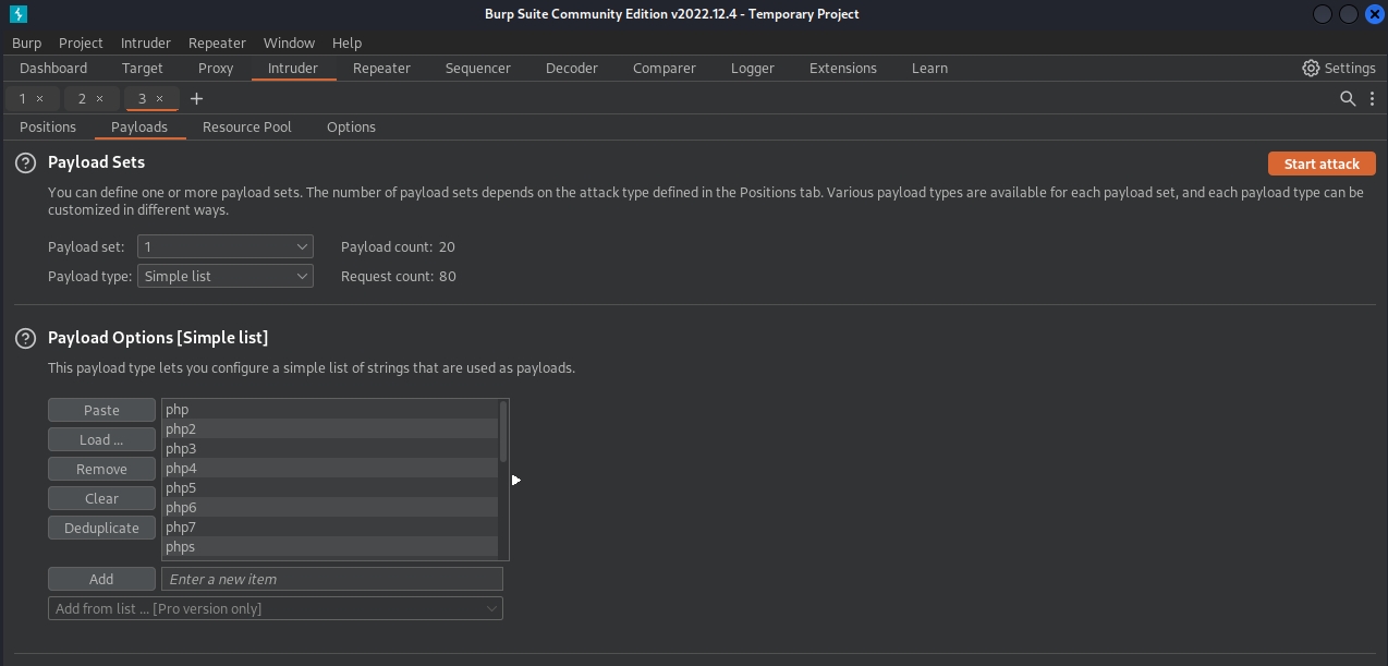 The first primary strategy for identifying a file upload vulnerability is by manipulating the file extension. There is a good list at hacktricks (https://book.hacktricks.xyz/pentesting-web/file-upload). I used the following list: php php2 php3 php4 php5 php6 php7 phps phps pht phtm phtml pgif shtml htaccess phar inc hphp ctp modulea