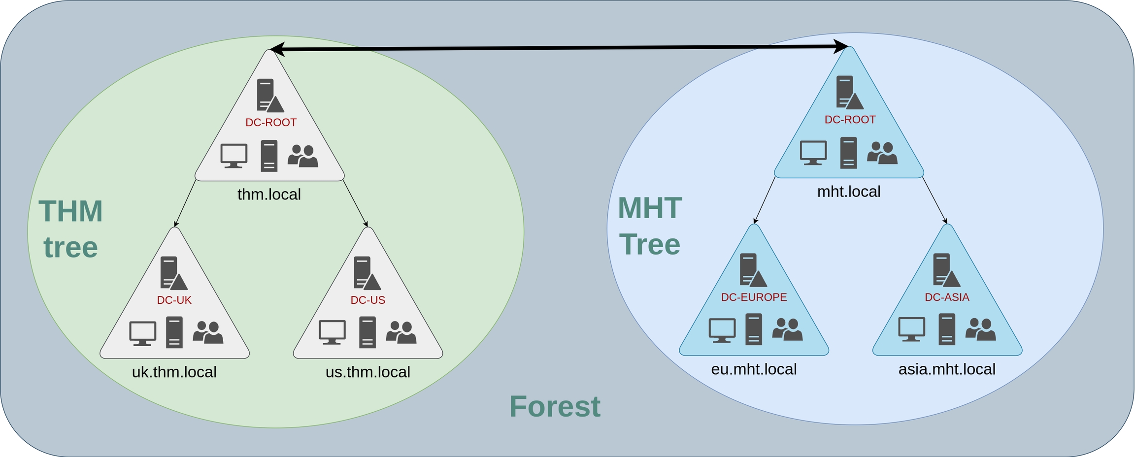 Having multiple domains organised in trees and forest allows you to have a nice compartmentalised network in terms of management and resources. But at a certain point, a user at THM UK might need to access a shared file in one of MHT ASIA servers. For this to happen, domains arranged in trees and forests are joined together by trust relationships.