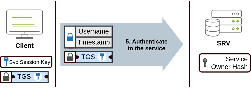 Kerberos step 2 The TGS can then be sent to the desired service to authenticate and establish a connection. The service will use its configured account's password hash to decrypt the TGS and validate the Service Session Key.
