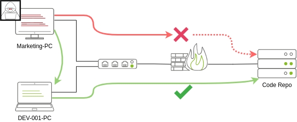 Marketing workstations will typically be limited through firewall policies to access any critical services on the network, including administrative protocols, database ports, monitoring services or any other that aren't required for their day to day labour, including code repositories.