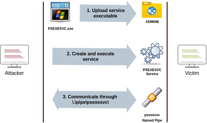 Connect to Admin$ share and upload a service binary. Psexec uses psexesvc.exe as the name.